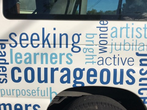 While meandering through my boxed up existence, I opened the blinds and gazed outside. The van was out front. Because I drove the work van home last evening in order to move some stuff to the apartment. The van is now covered in blue words. Previously it was all white. The word which caught my attention first was “courageous”. Most likely because it’s in larger font and pretty much in the middle.